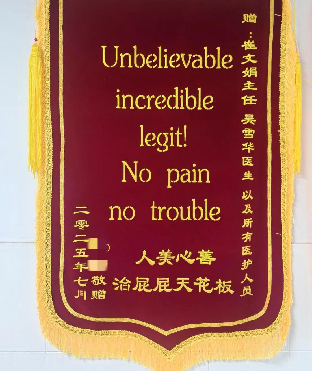 熟悉肛腸科的人都知道,這里時常因患者的 “巧思” 充滿歡樂,近期科室就接連收到了好幾面別具一格的錦旗。其中一面寫著 “Unbelievable incredible legit!No pain no trouble 人美心善 治屁屁天花板”,中西結(jié)合的表達既俏皮又真誠;還有一面則用 “手術(shù)不疼換藥不疼,肛好有你高水平!” 的諧音巧語傳遞謝意。這些充滿趣味的錦旗文字,從側(cè)面印證了肛腸科在創(chuàng)面疼痛管理方面取得了良好成效,也是患者對我們診療服務(wù)的肯定認可。