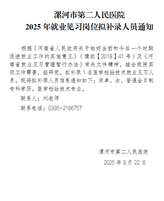 【公示】漯河市第二人民醫(yī)院2025年就業(yè)見習(xí)崗位擬補(bǔ)錄人員通知