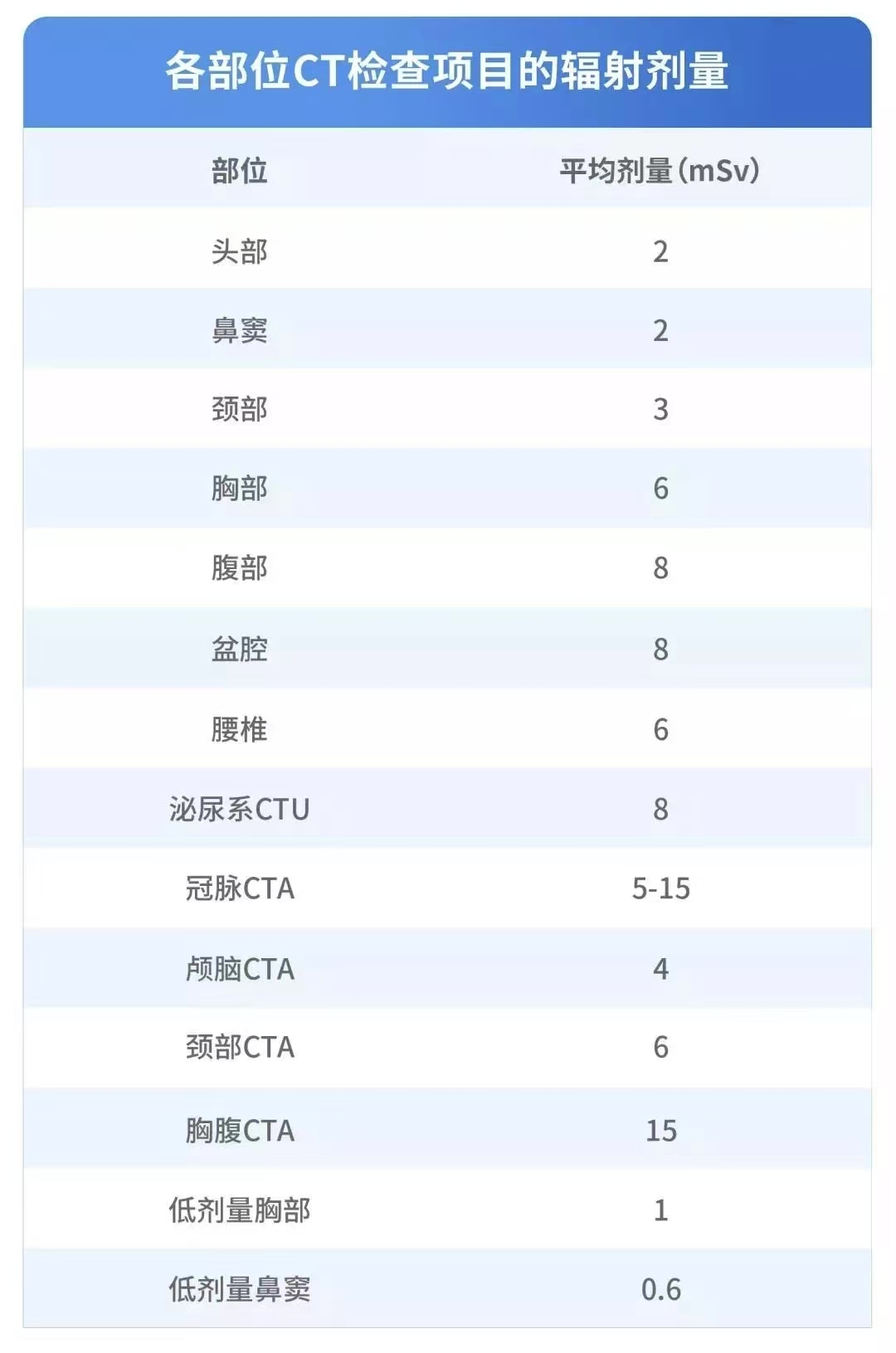 下圖是身體各個(gè)部位做CT檢查,承受的輻射劑量。我國(guó)規(guī)定放射工作人員年輻射劑量50mSv。