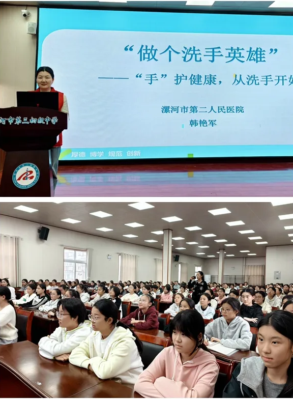 此外,市二院感控辦工作人員專程走進市第三初級中學(xué),為學(xué)生們帶來了一場別開生面的手衛(wèi)生知識講座。工作人員以“手”護健康為切入點,通過專題講座、播放宣傳視頻、講解洗手重要性、演示“七步洗手法”等環(huán)節(jié),深入淺出地向同學(xué)們闡述了洗手這一最簡單、經(jīng)濟且有效的健康守護方法,有效提升了青少年群體的手衛(wèi)生知識與自我防護能力。