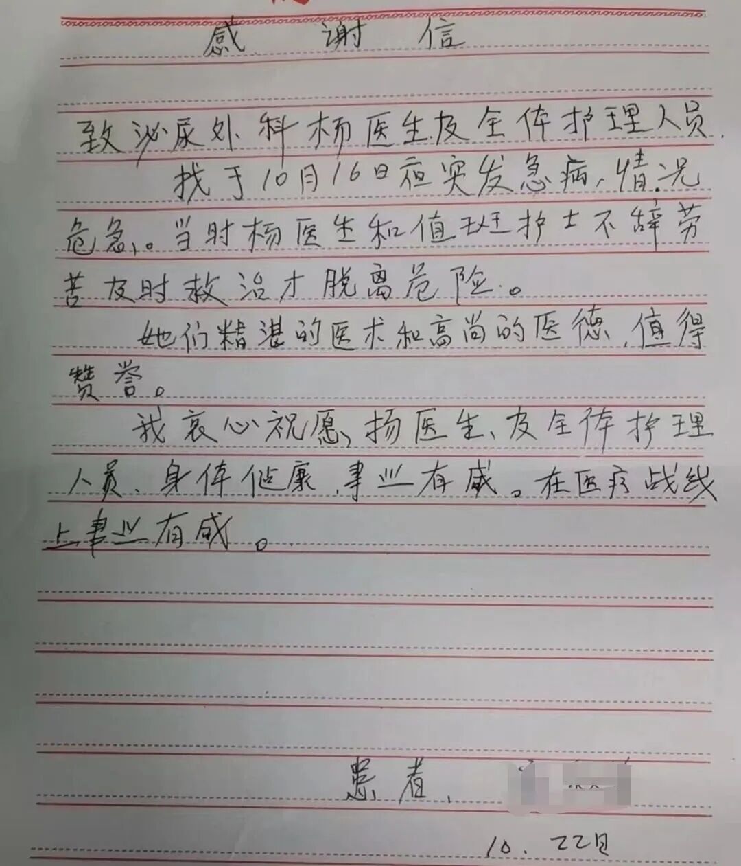 為感謝楊艷霞醫(yī)生的及時救治和護(hù)士們的貼心照顧,出院后患者特意寫下一封感謝信,字里行間滿是對楊醫(yī)生專業(yè)醫(yī)術(shù)、敬業(yè)精神和人文關(guān)懷的由衷贊譽(yù),也表達(dá)了對醫(yī)院泌尿外科醫(yī)療服務(wù)的高度認(rèn)可。
