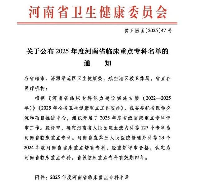 近日,河南省衛(wèi)生健康委發(fā)布《關(guān)于公布2025年度河南省臨床重點名單的通知》(豫衛(wèi)醫(yī)函〔2025〕47號),漯河醫(yī)專二附院(漯河市骨科醫(yī)院、漯河市立醫(yī)院)運動醫(yī)學(xué)科與護理??瞥晒νㄟ^評審被確定為河南省臨床重點專科。漯河醫(yī)專二附院再添兩個省級臨床重點???,標(biāo)志著這兩大專科在醫(yī)療技術(shù)、科研創(chuàng)新、服務(wù)質(zhì)量及區(qū)域影響力等方面達到省內(nèi)領(lǐng)先水平。