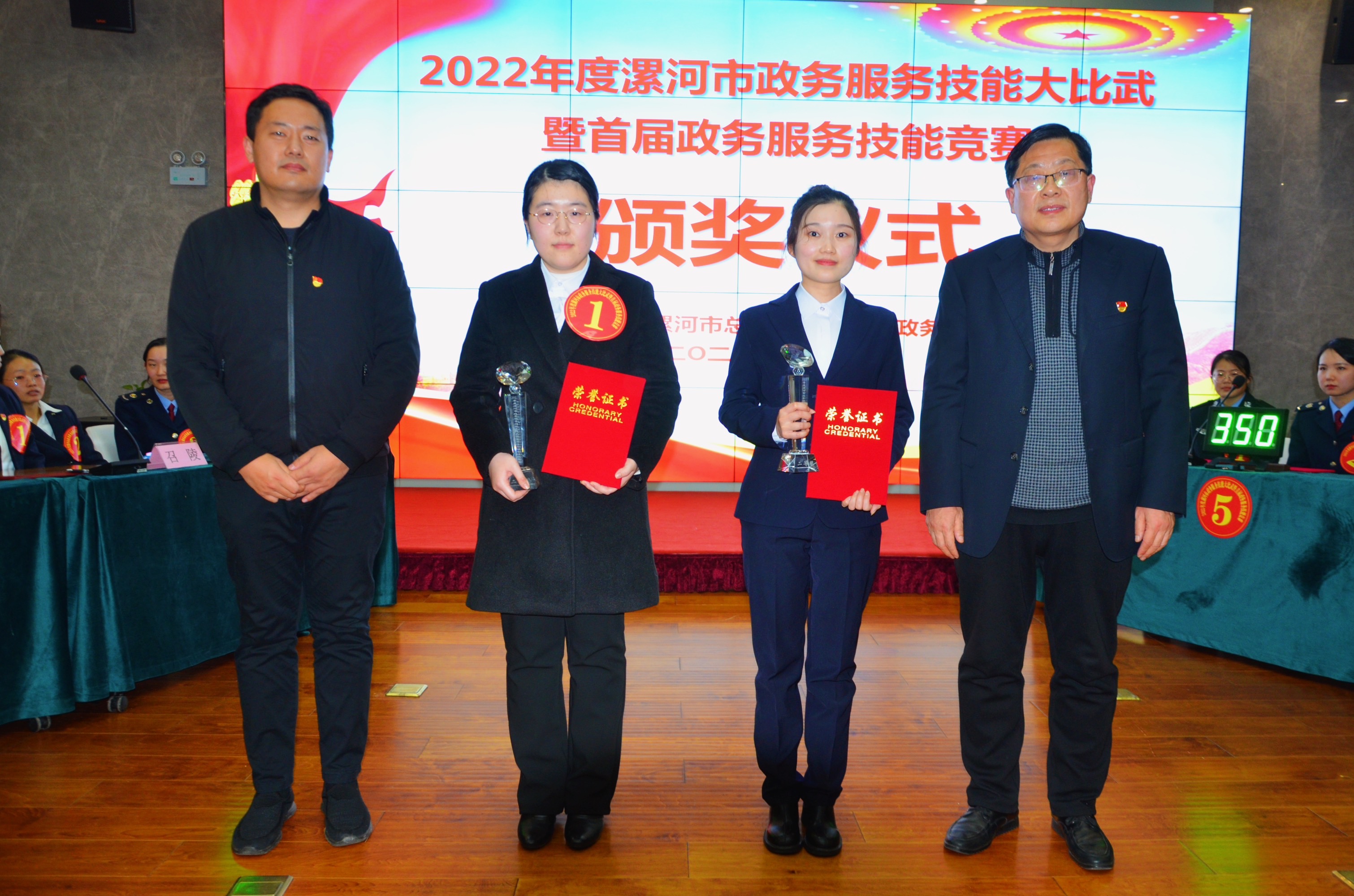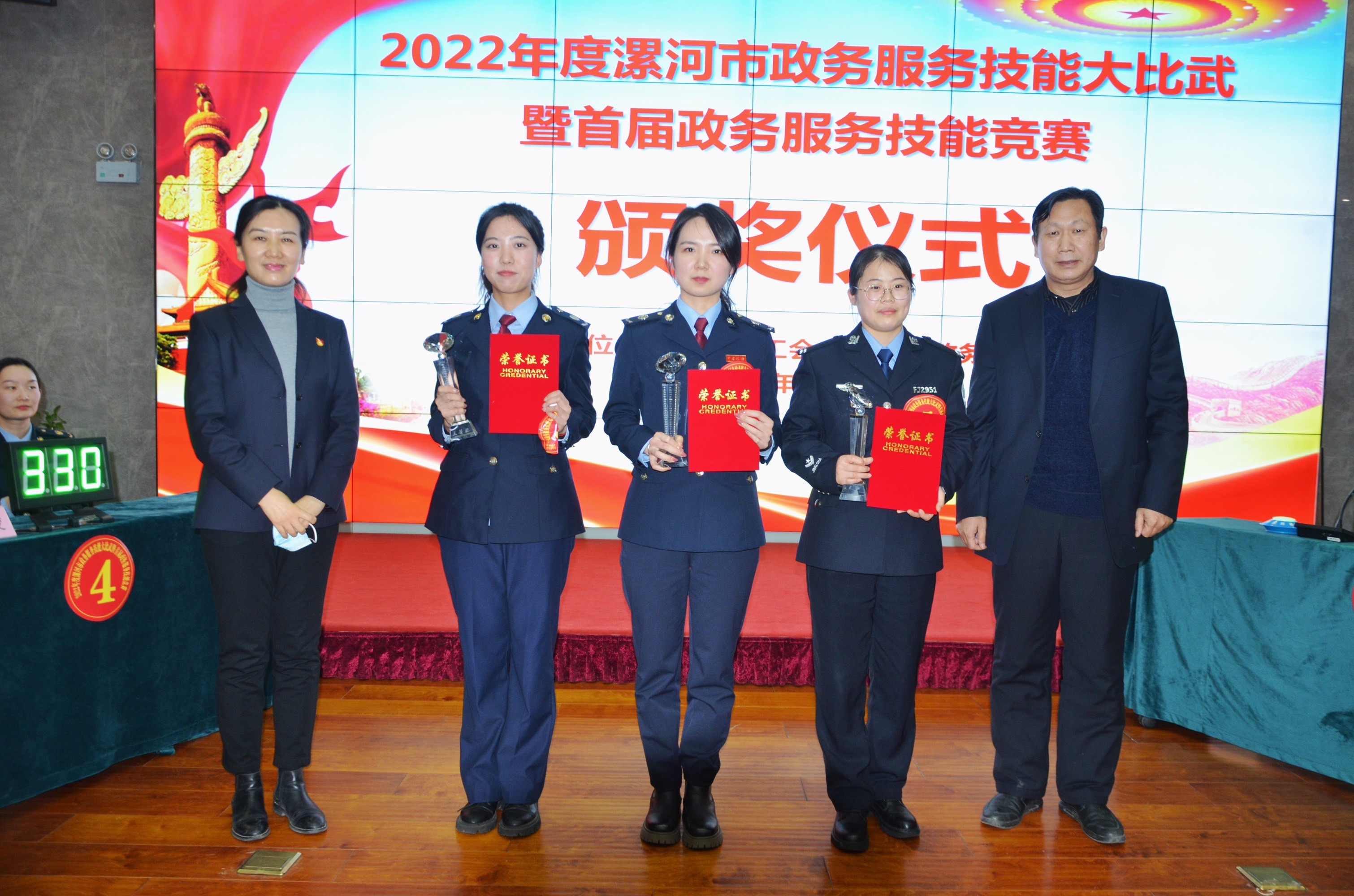 比賽中,各參賽代表隊奮勇爭先、激烈角逐;各參賽隊員在賽場上互相配合,充分發(fā)揮出團(tuán)隊的作用。最終,舞陽縣行政服務(wù)中心代表隊獲得團(tuán)體一等獎,張小麗同志獲得個人一等獎;召陵區(qū)行政服務(wù)中心、市政務(wù)服務(wù)中心人社公安稅務(wù)聯(lián)合隊2個代表隊獲得團(tuán)體二等獎,孟希瑞、黃丹2名同志獲得個人二等獎;郾城區(qū)行政服務(wù)中心、臨潁縣行政服務(wù)中心、經(jīng)濟(jì)技術(shù)開發(fā)區(qū)行政服務(wù)中心、3個代表隊獲得團(tuán)體三等獎,劉玉、劉暢、范亞男3名同志獲得個人三等獎;舞陽縣行政服務(wù)中心、經(jīng)濟(jì)技術(shù)開發(fā)區(qū)行政服務(wù)中心、市政務(wù)服務(wù)中心不動產(chǎn)登記窗口3個代表隊獲得優(yōu)秀組織獎,本次總決賽還設(shè)置了團(tuán)體優(yōu)秀獎和個人優(yōu)秀獎若干。評委會成員為獲得獎項的代表隊和參賽隊員頒獎。