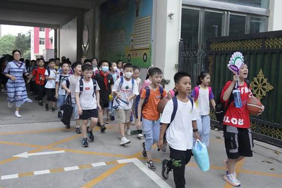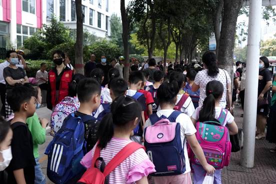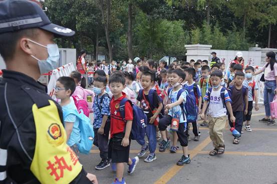 18點(diǎn)15分,錯(cuò)峰放學(xué)的三、四年級(jí)學(xué)生按照南北兩隊(duì)分別從學(xué)校南北兩個(gè)大門(mén)走出,行至各自的接送點(diǎn)。18點(diǎn)30分,最后放學(xué)的高年級(jí)學(xué)生也分成兩隊(duì)走出校門(mén),18點(diǎn)40分,全校學(xué)生全部有序離校,沒(méi)有擁堵現(xiàn)象發(fā)生。
