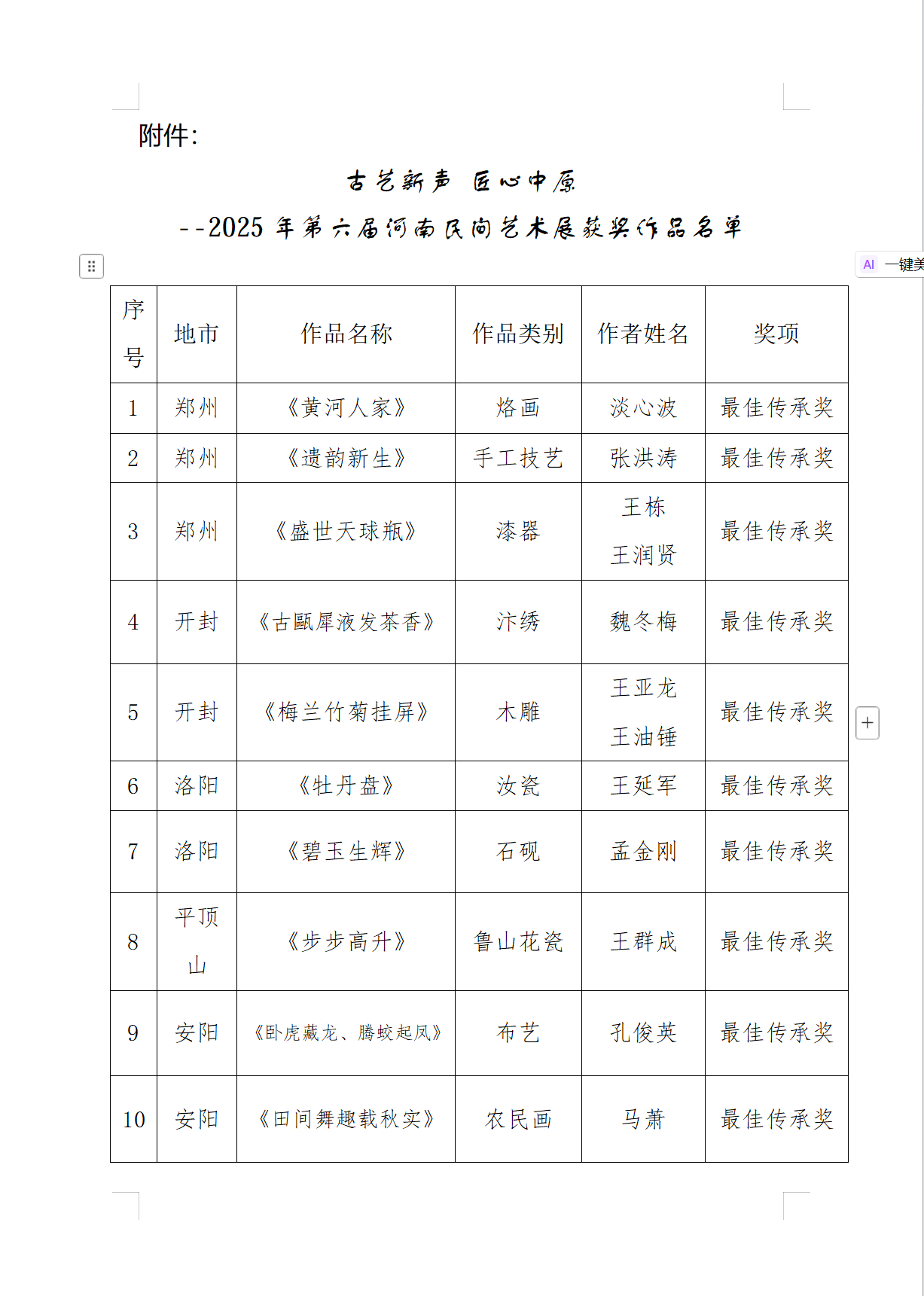 據(jù)悉,根據(jù) 2025 河南惠民文化活動(dòng)總體安排,河南文化館組織開(kāi)展的第六屆河南民間藝術(shù)展作品征集工作,經(jīng)全省縣、市各級(jí)推薦,共收到作品 30 類 1500 余件。經(jīng)專家評(píng)審,共評(píng)出最佳傳承獎(jiǎng)20 個(gè),優(yōu)秀獎(jiǎng)40 個(gè),別具匠心獎(jiǎng)60 個(gè),榮譽(yù)參展獎(jiǎng)20 個(gè)。(漯河市廣播電視臺(tái)網(wǎng)絡(luò)部記者:柴全偉)