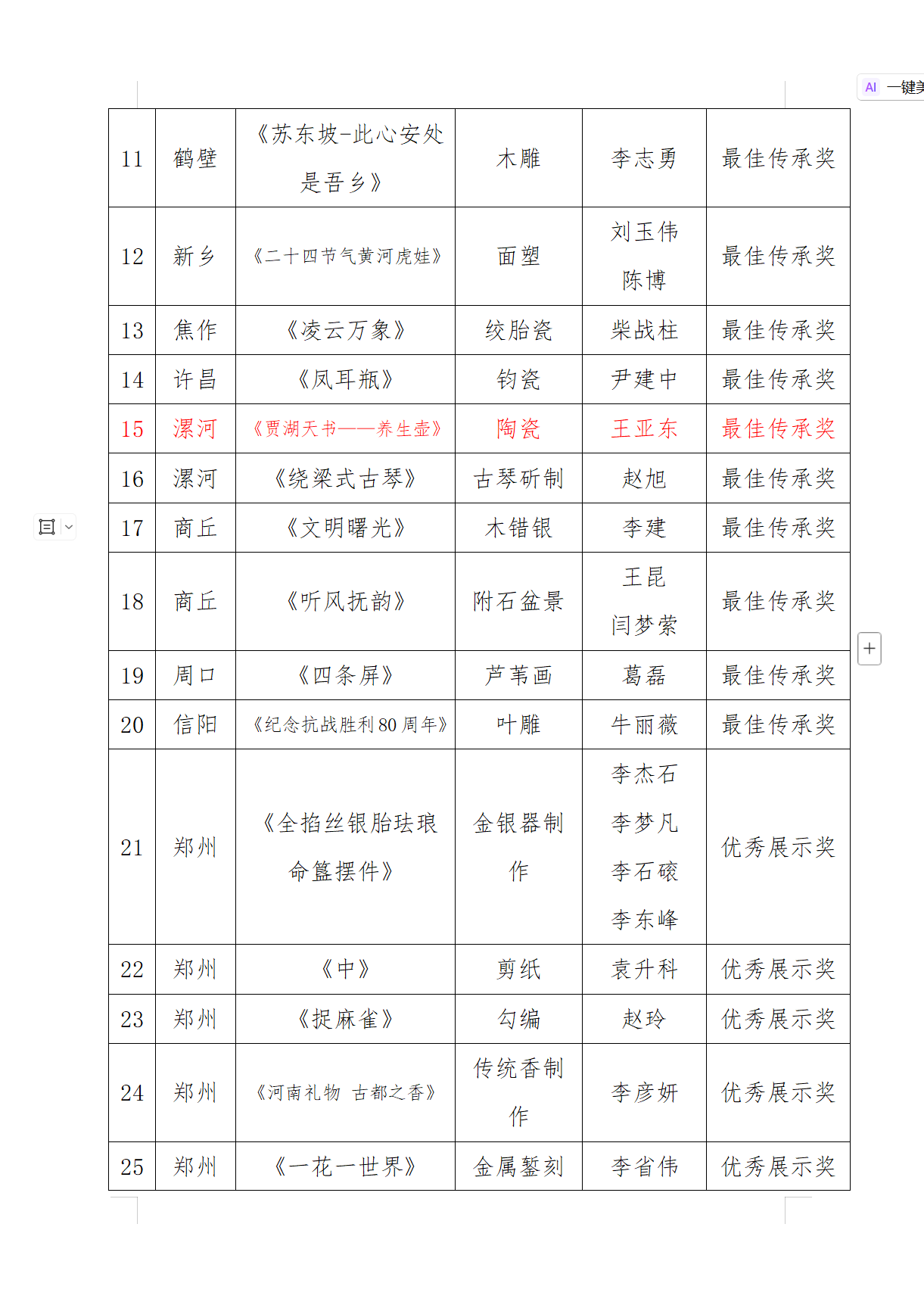 2025 年 12 月 10 日,河南省文化和旅游廳公示 “古藝心聲 匠心中原” 第六屆河南民間藝術(shù)展評(píng)審結(jié)果,漯河市舞陽(yáng)縣文化館選送的《賈湖天書養(yǎng)生壺》榮獲此次展覽最高獎(jiǎng) ——最佳傳承獎(jiǎng)。